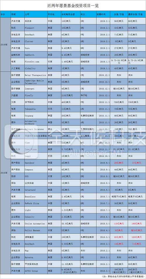 据全天候科技不完全统计,在 2018 年 2 月至 2019 年 2 月的 13 个月中,除 Uber 和 Grab(两笔投资始于 2017 年)外,愿景基金投资企业达 38 家,投资金额逾 320 亿美元。在其全部交易中,仅有 5 个被投公司估值呈现明显增长,其它企业短时间内尚未看到收益。