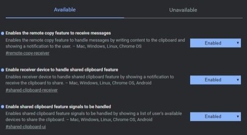使用搜索框查找“剪贴板”(clipboard)。应该会弹出三个标志:“使接收器设备能够处理共享剪贴板功能”(Enable receiver device to handle shared clipboard feature),“使共享剪贴板功能信号能够被处理”(Enable shared clipboard feature signals to be handled)和“同步剪贴板服务”(Sync clipboard services);